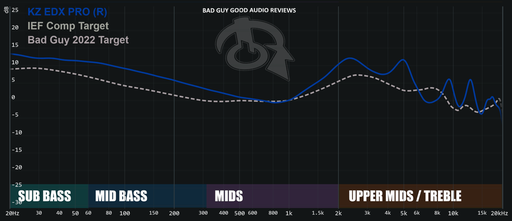 El rendimiento general en graves del EDX PRO es aceptable, principalmente por la cantidad y extensión que otorgan cuerpo y calidez al sonido. Sin embargo, la calidad es deficiente en varios aspectos. Los sub-bajos (20-60 Hz) muestran poco control, profundidad y volumen, lo cual se nota en géneros como Phonk donde falta textura y control. Los bajos (60-200 Hz) poseen poca autoridad y velocidad en el golpe, resultando en una ejecución no limpia y un golpe deficiente en géneros como Trap. Los graves superiores (200-700 Hz) son los más presentes, dando una sensación envolvente y a veces divertida, pero su falta de control y detalle hace que a menudo se sientan "flojos" (Electrónica), sobre-extendidos (Electrónica), o "embarrados" y con poca textura (Jazz), llegando a entorpecer otros instrumentos en música densa (Ragtimecore).