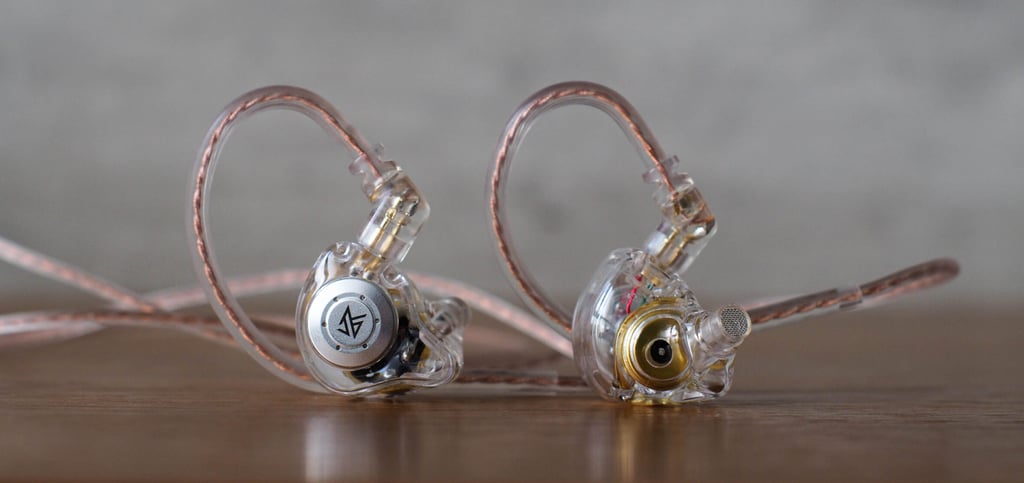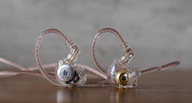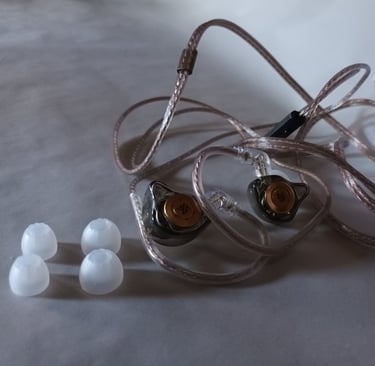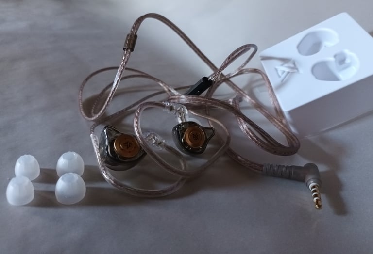 La caja es bastante pequeña alrededor de 10x10 cm hecha de plástico. Al abrir la caja se ven los IEM en sus moldes de plástico como si fueran una magdalena. Los cables y almohadillas vienen en una bolsita fina de plástico descartable, solo traen 3 pares de almohadillas de silicona, material genérico pero con un pequeño pliegue interesante en las puntas. El diseño de los auriculares es algo industrial, muy sencillo con su plástico semi transparente y su plaquita. El cable es delgado, no muy flexible y con terminación en L.
